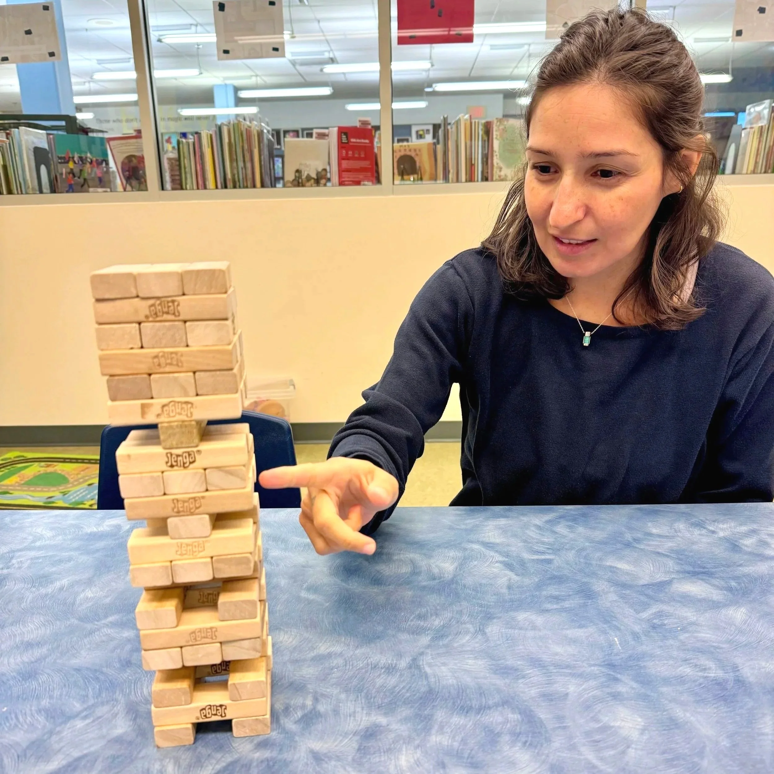 Playing Jenga with my family at the library